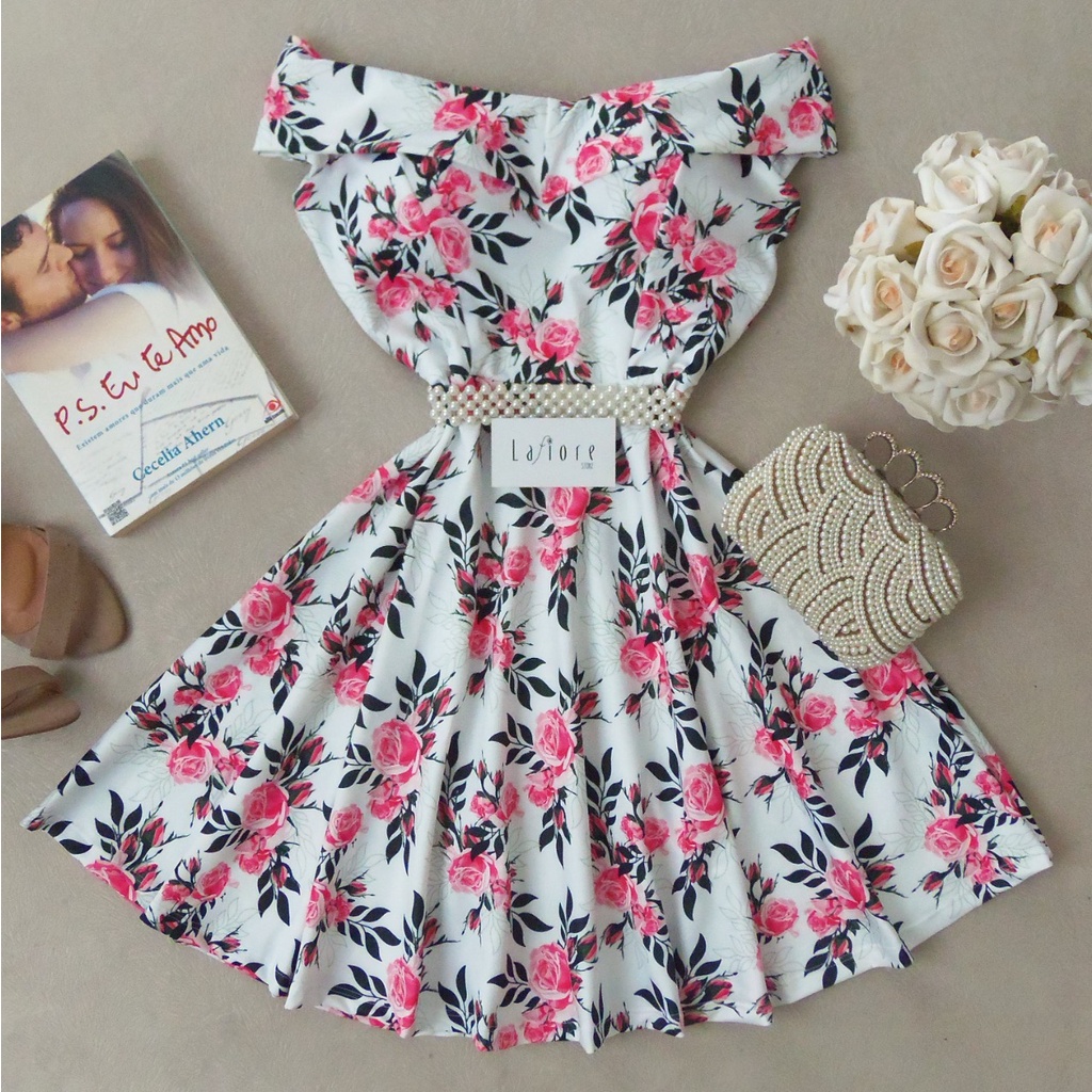Vestido Curto Rodado Ombro a Ombro Branco com Flores