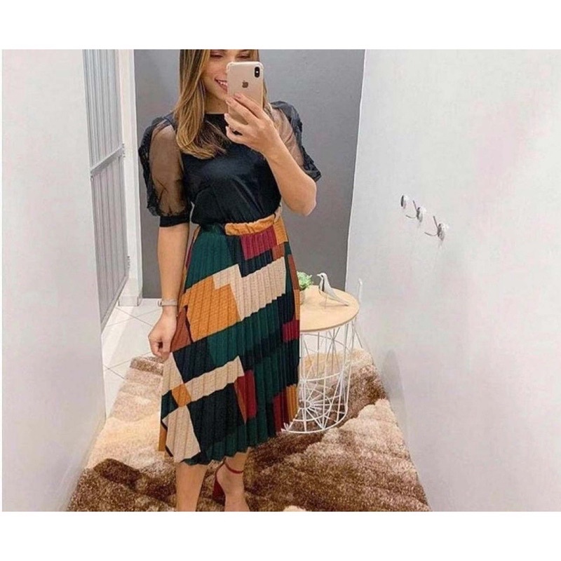 Saia Midi Plissada - Estampas Geométrica - Cintura Alta - Moda Evangélica k-15