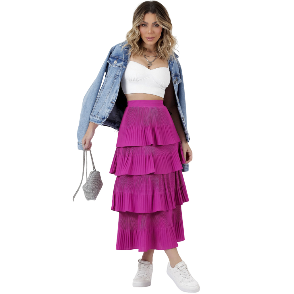 Saia Plissada Midi Babado Feminina Cintura Alta 4 Camada Top