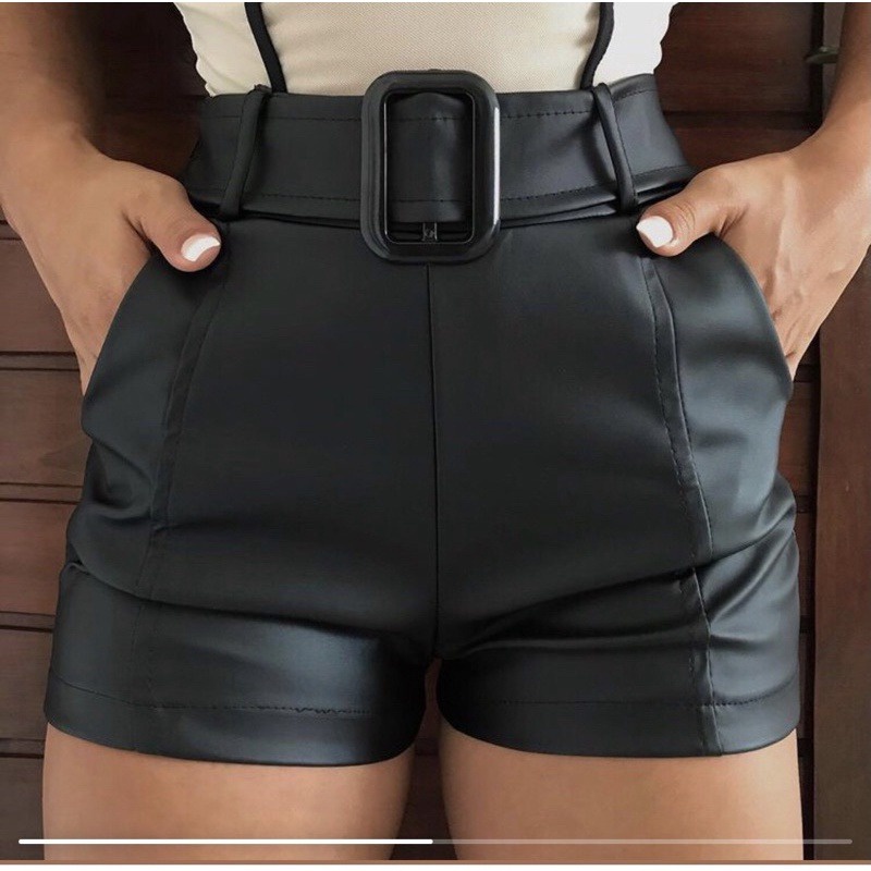 Short Couro Fake Tecido Cirre Cintura Alta Com Cinto - Preto