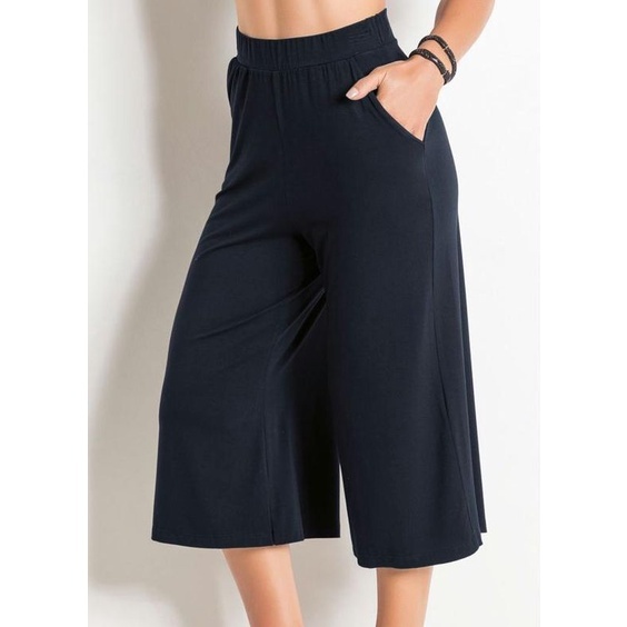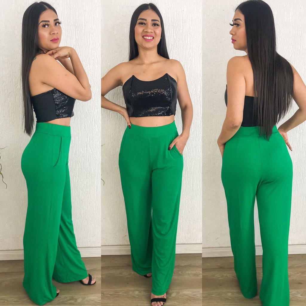 Calça Feminina Pantalona cós alto elástico com bolsos malha visco lycra