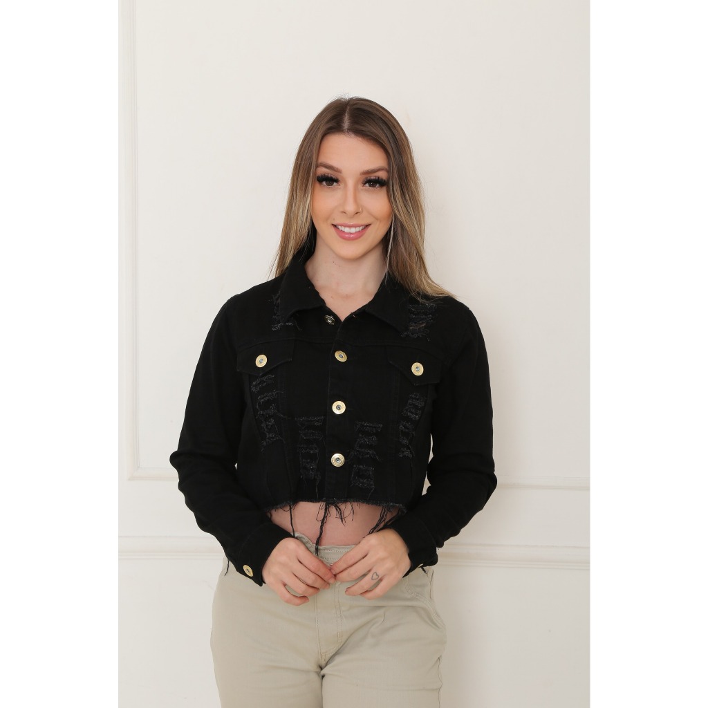 A Jaqueta Jeans Feminina Preta Cropped com Manga Comprida, Detalhes Destroyed.