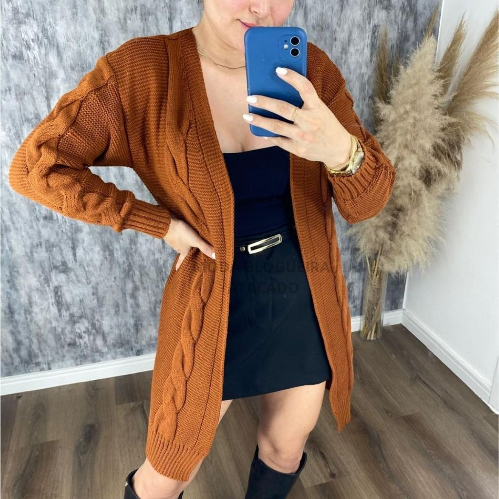 Cardigan Feminino de Tricô Manga Longa Trança Sobretudo Inverno Tecido Grosso casaco longo Max kimo