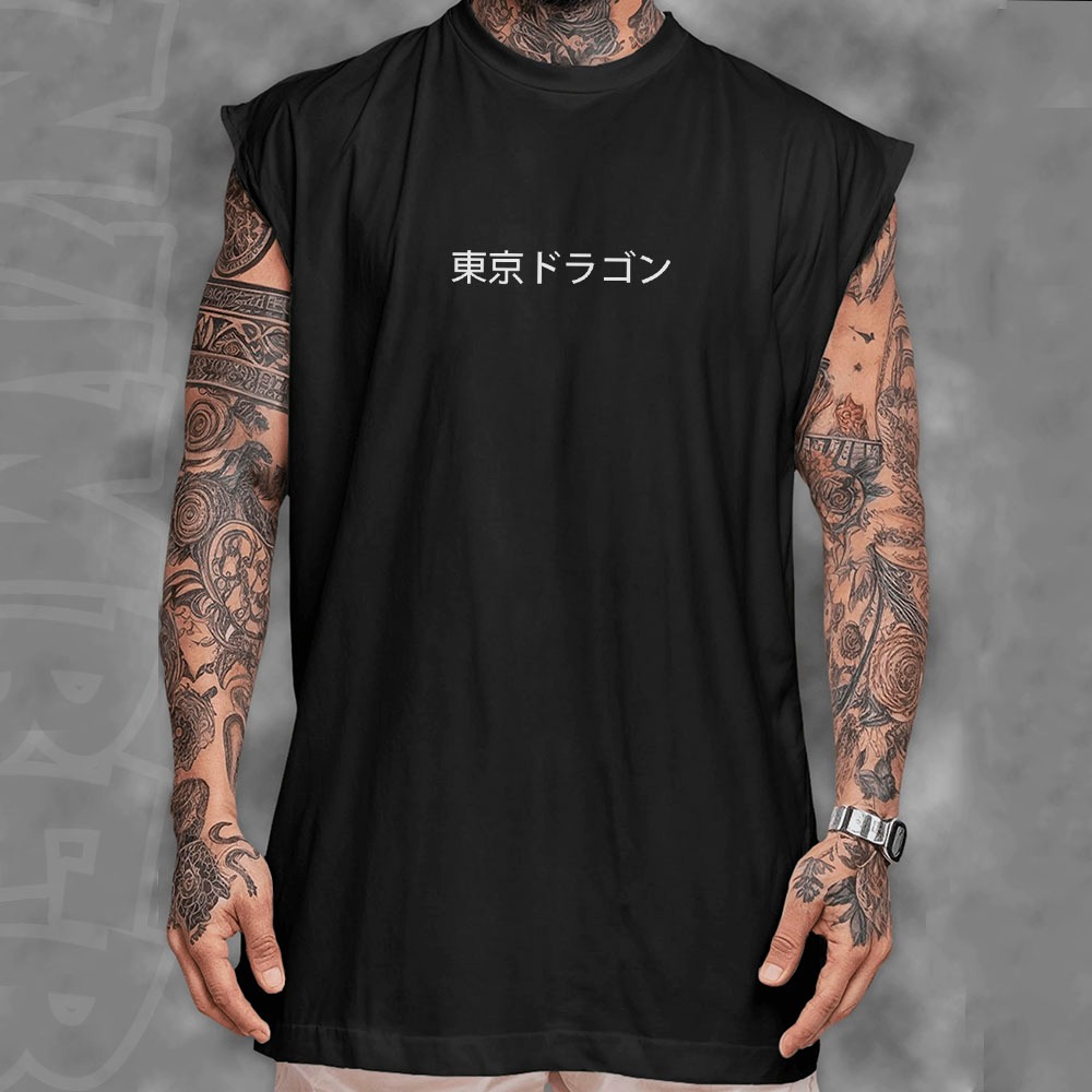 Camiseta regata machao oversized masculino escrita japonesa dragao de toquio em algodao unissex Longline