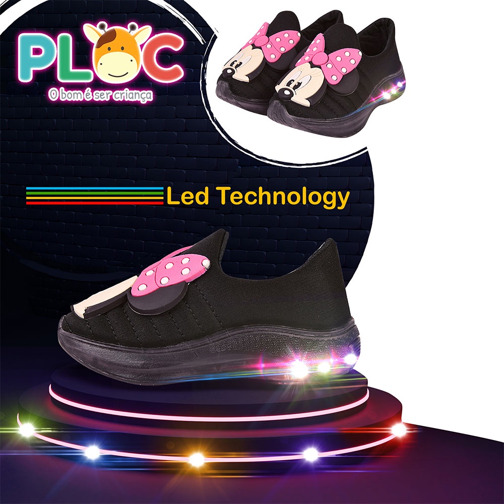 Tênis Led Infantil Luzinha Menina Meia Calce Fácil Leve Flexível Confortável Anatômico PLOC LED03 - MINNIE POÁ PINK