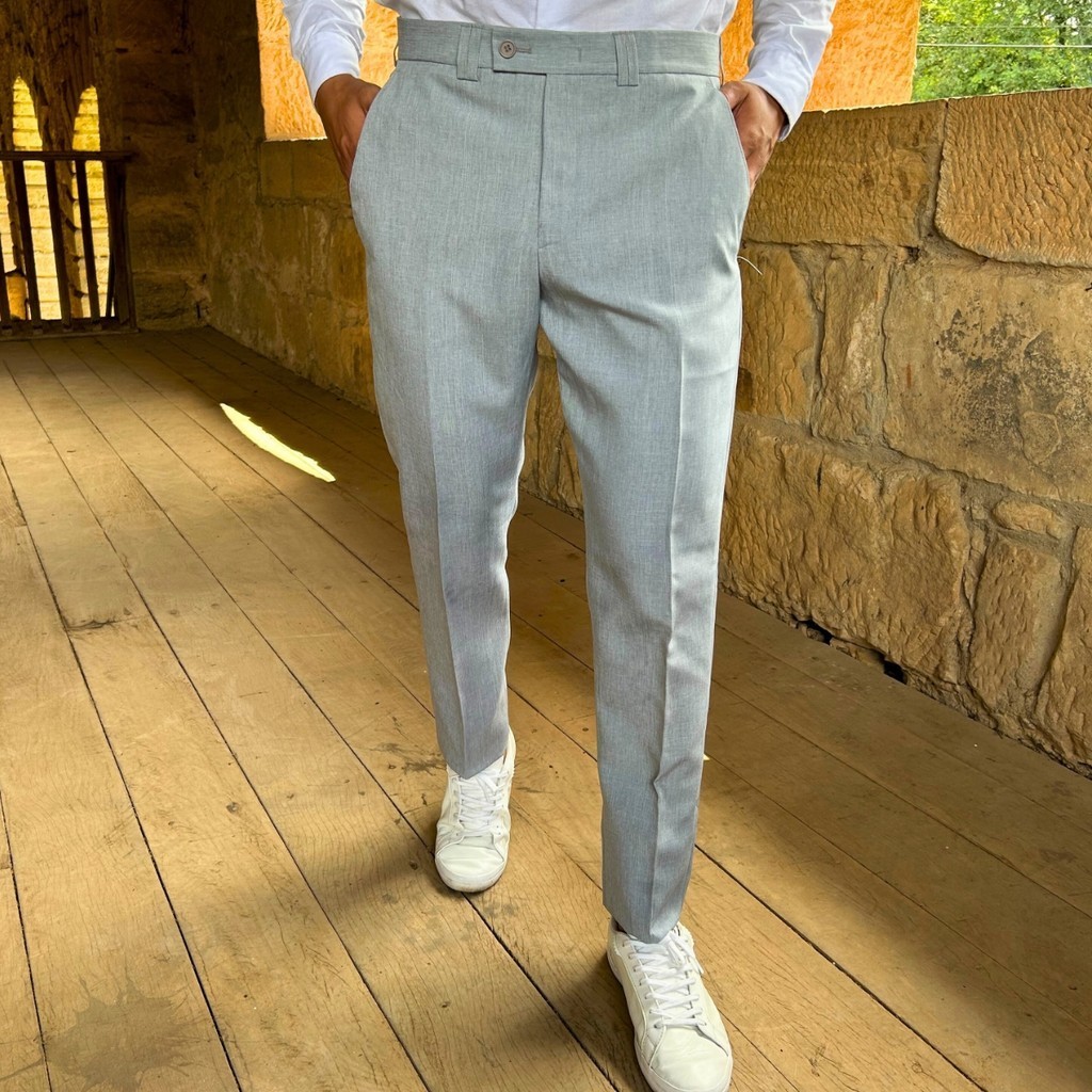 Calça Social Masculina Cinza Claro com textura em linho, modelagem Slim e aviamentos premium. Peça versátil para ser usada em diferentes ocasiões, como para trabalhar, eventos religiosos, casamentos e uniformes.