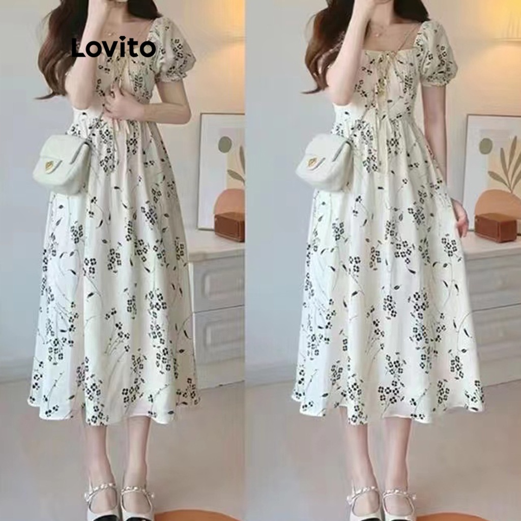 Lovito Casual Vestido Feminino Floral com Manga Bufante LNE11043 (Off White)