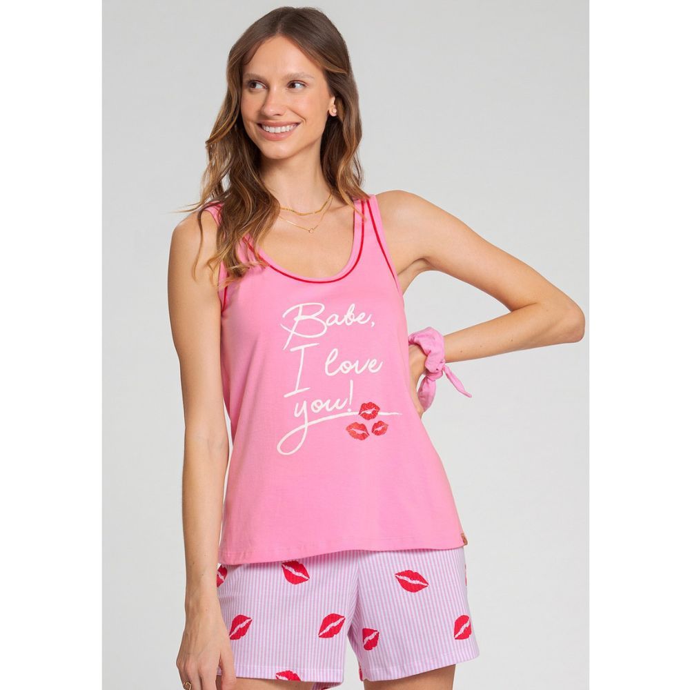 Pijama Regata Feminino Rosa com Estampa de Bocas