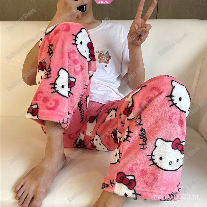 Sanrio Anime Hello Kitty Pijama Flanela Preto Rosa Feminino Lã Quente Casual Calças Na Moda Outono Inverno