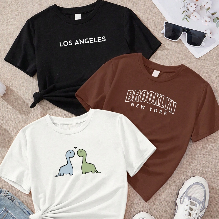 Blusa feminina de algodão kit com 3 los angeles, Brooklyn, Dinossauro blusa marrom preta Off white