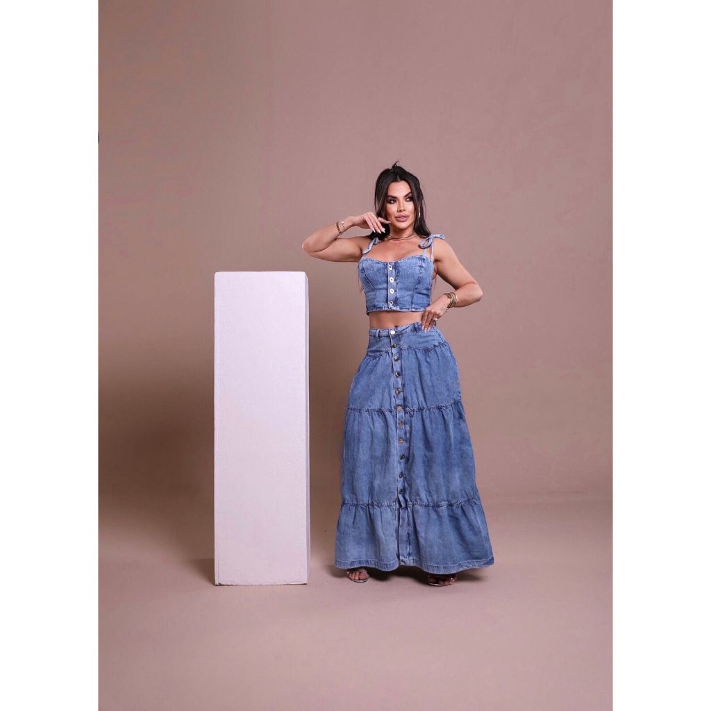 Conjunto jeans saia longa cintura alta 100% algodão