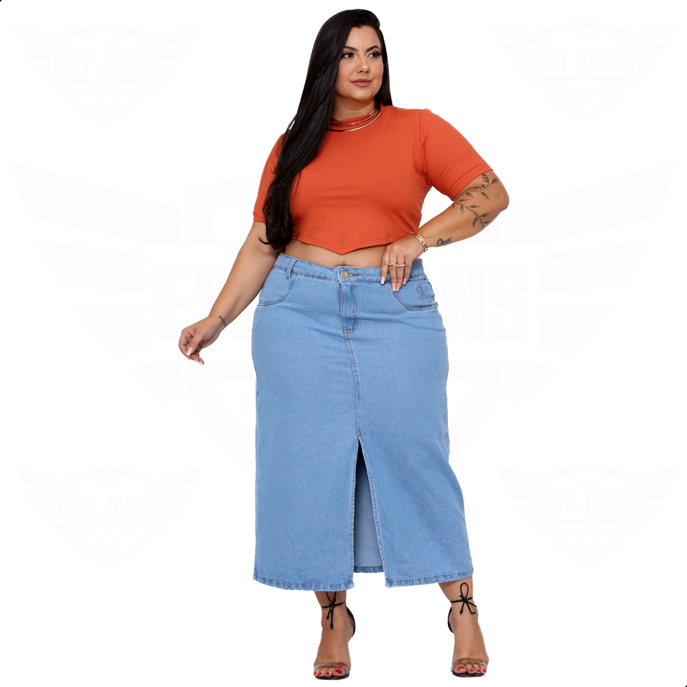 Saia Longa Jeans Plus Size com Abertura / Fenda Frontal - EWF - Azul Médio