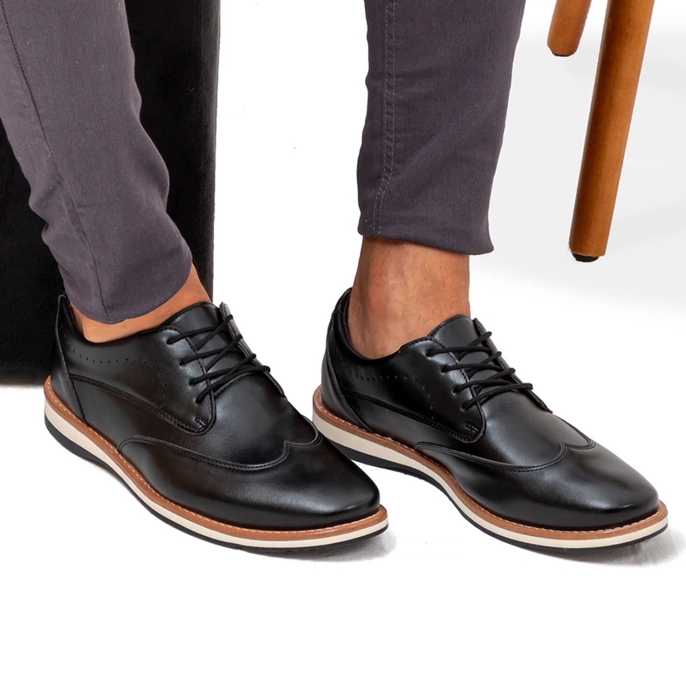 Sapato Masculino Oxford Derby Casual em Sintético Preto e Marrom com Cadarço e Sola Eva Tapete Borracha Micro Expandida Preto e Marrom