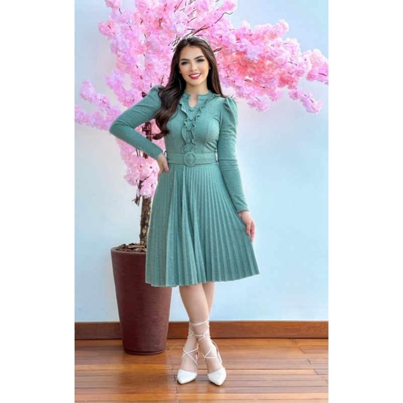 Vestido Plissado Babado Verde Bandeira Urbania Midi Rodado Moda Evangelica com cinto Manga princesa