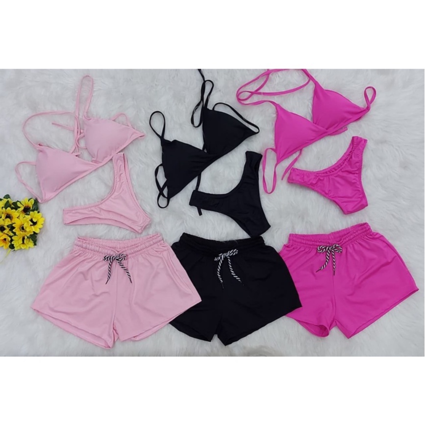 kit Trio Biquíni com Bojo Mais Shorts Praia Luxo Blogueira Asa Delta Neon lançamento