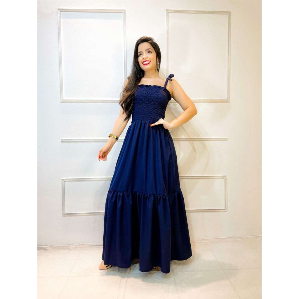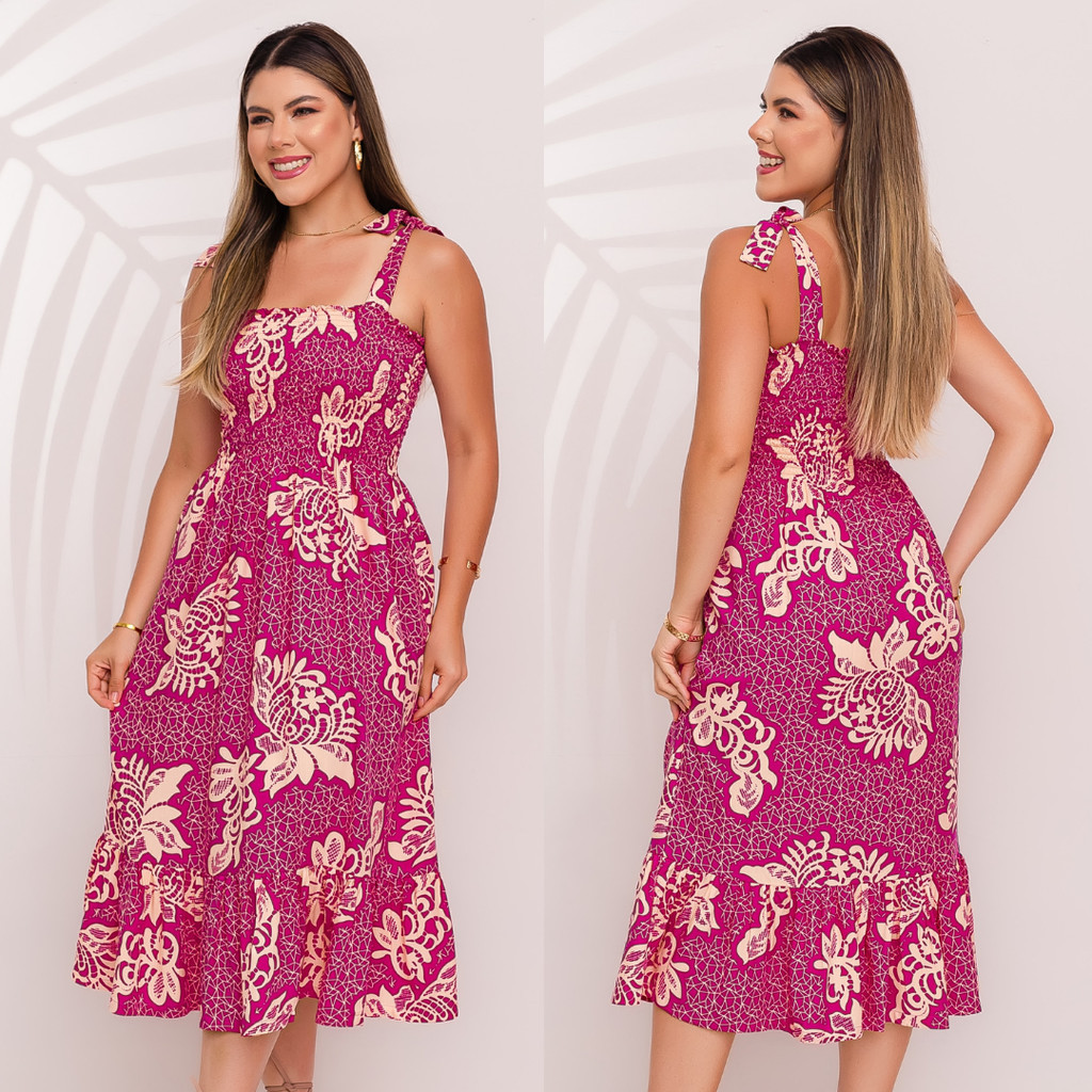 Vestido Midi de Lastex Badado Alças Largas de Amarração Vestido Lastex