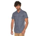 Camisa Manga Curta Slim Masculina Bolso Algodão Lisa Jovem Azul