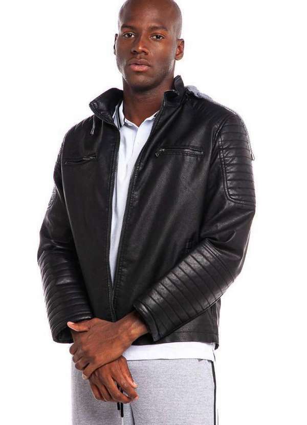 Polo Wear - Jaqueta Masculina Couro Pu com Capuz Polo Wear Preto Preto