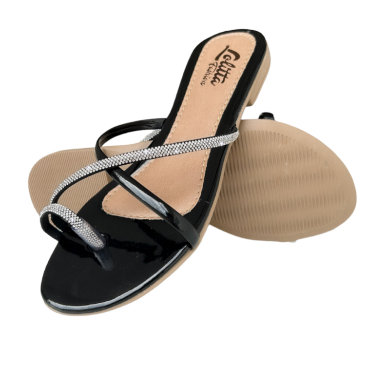 Sandália Rasteira feminina Dedo Tiras Sola Brilho Chyrrô Preto