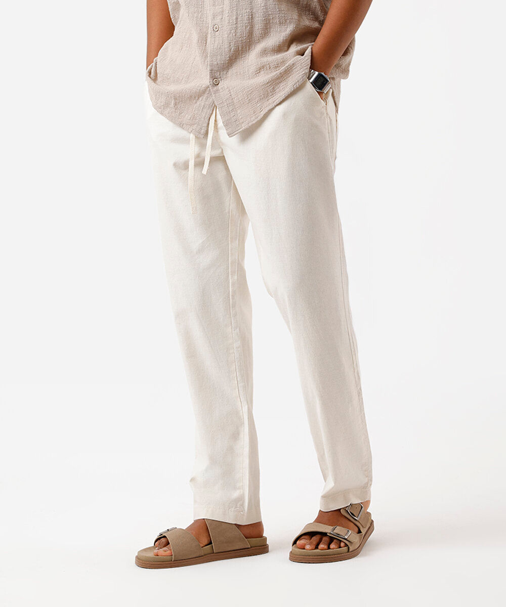 Calça de Linho Mango Slim Alfaiataria Amarração Off White