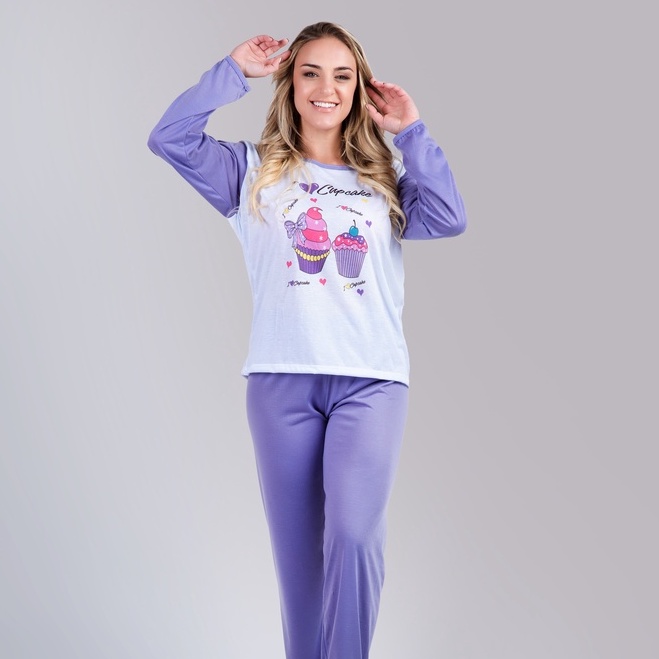 Kit 2 Pijama Longo Adulto Conjunto Dormir Feminino Frio Manga Comprida Estampa Sortida Poliéster Linha Noite Inverno 314