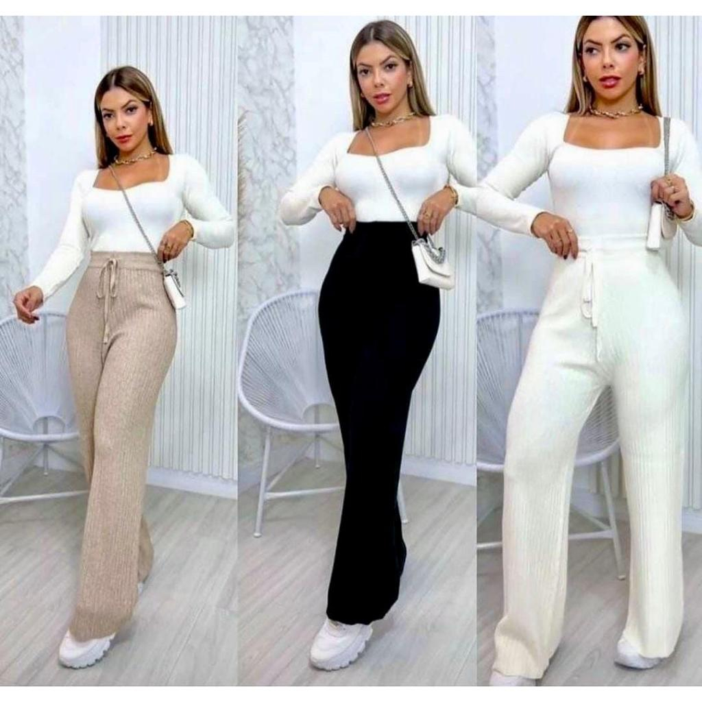 Calça Feminino Pantalona Wide Leg Tricô Tricot Modal Calças Casuais Social Lisas Com Cordão Preto Bege Branco Estilosos Tendencia Inverno Luxo Elegante Moda 2024