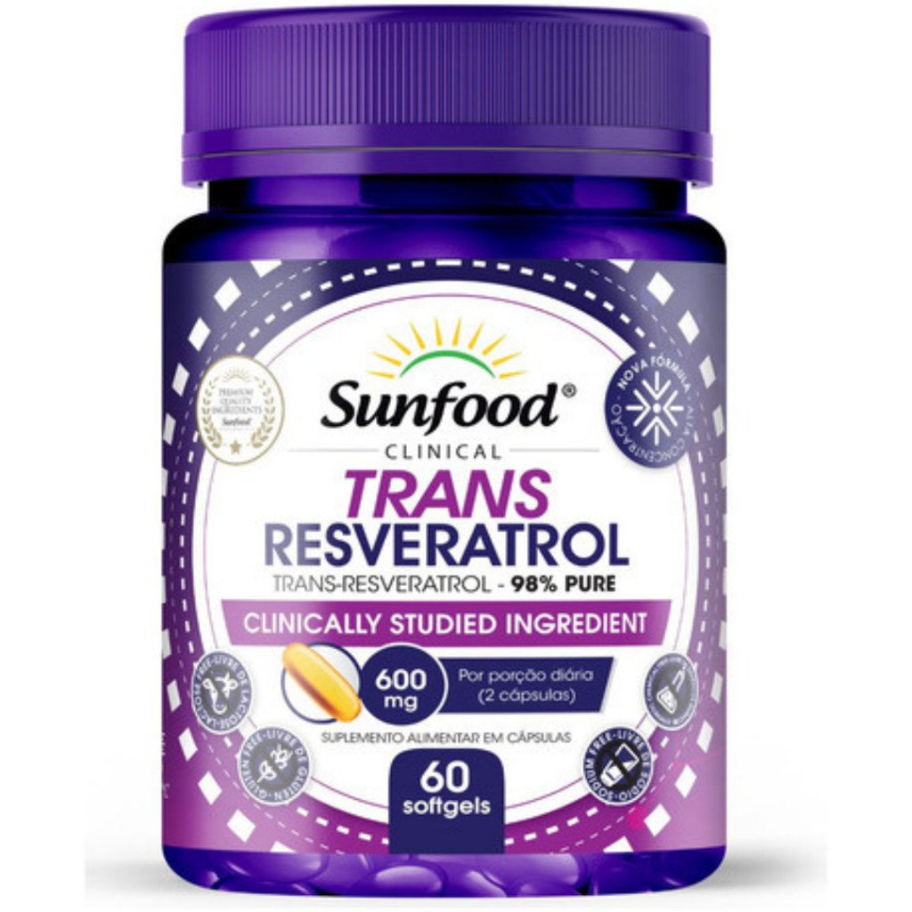 Suplemento em cápsula Sunfood Clinical Trans Resveratrol 98% pure 600mg (60sofgels) Sunfood em pote de 100mL