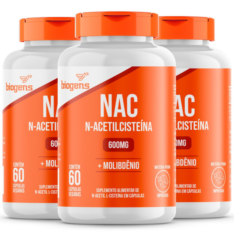 KIT 3X NAC 600MG + MOLIBDêNIO 30 CAPS VEGANAS. BIOGENS Neutro
