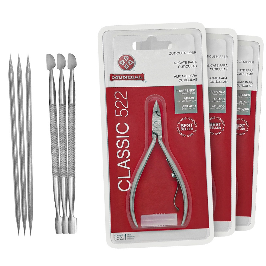 Alicate Mundial Cutícula 522 Classic kit com 3 alicates+ 3 Espátulas +3 Palitos - PROMOÇÃO
