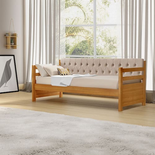 Sofá Cama Solteiro Verona Mona Imbuia Estofado Capitonê Veludo Bege