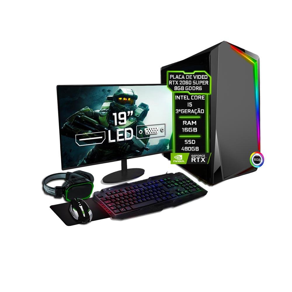 Pc Gamer Completo Fácil, Intel Core I5 3ª Geração, 16GB, RTX 2060 Super 8GB, SSD 480GB, Windows 10 + Monitor 19 LED + Kit Gamer