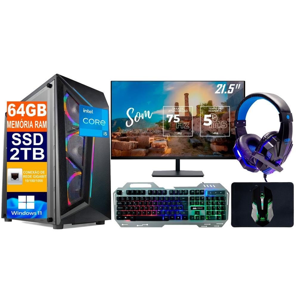 PC Tech Power, Intel Core I5 10400, SSD 2TB M2 Nvme, 64GB De Memória, DDR4, Monitor 21.5 " 75hz + Teclado E Mouse + Headset, WINDOWS 11 Pro