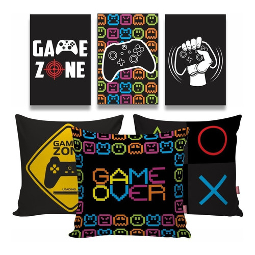 Kit 3 Quadros+ 3 Capas Almofada Vídeo Game Jogo Gamer Quarto