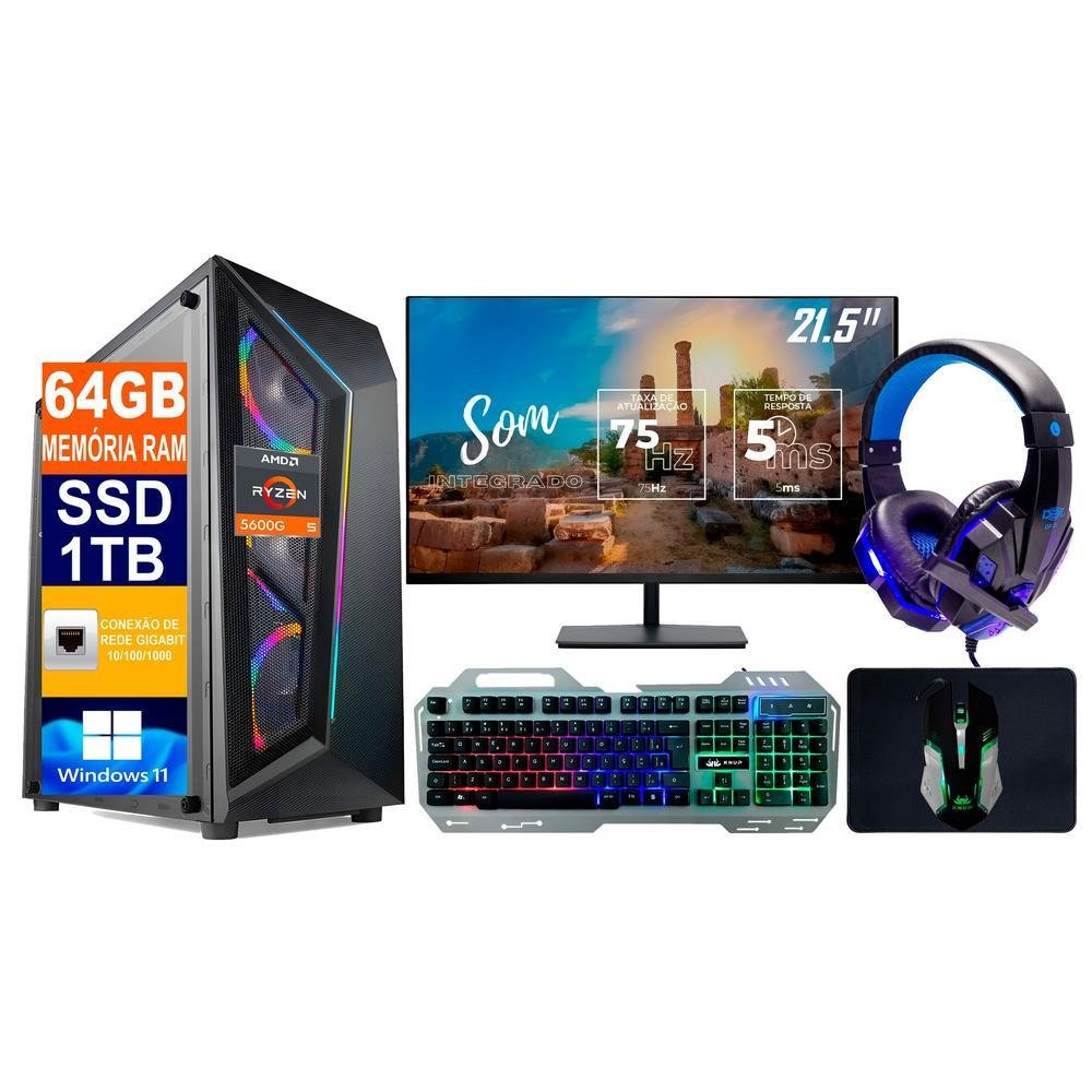 PC Gamer Tech Power Shop AMD Ryzen 5 5600G, 64GB RAM, SSD 1TB, Windows 11 Pro + Monitor 21.5 Polegadas + Teclado + Mouse + Headset