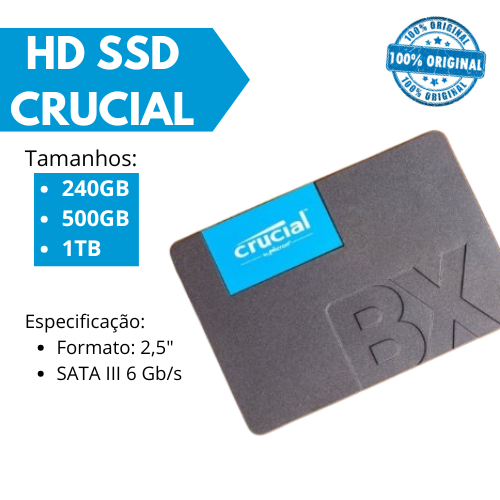Hd Ssd 240GB / 500GB / 1TB Crucial BX500 2.5'' SATA III 6Gb/s Leitura 540 MB/s e Gravação 500 MB/s