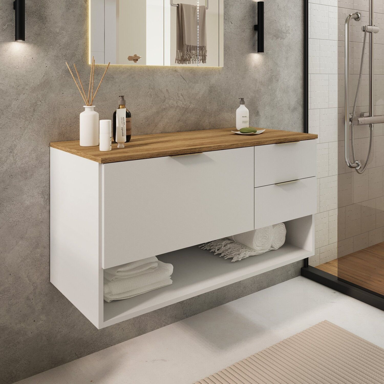 Gabiente para Banheiro Suspenso 80cm Alice com Balcão 2 Gavetas e Espelheira com Cuba Branca