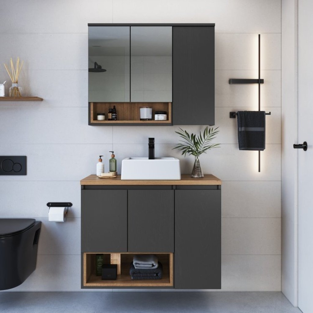 Conjunto para Banheiro Gabinete Suspenso 80cm com Cuba e Espelheira 3 Portas e Nicho Cecília Mel/Grafite