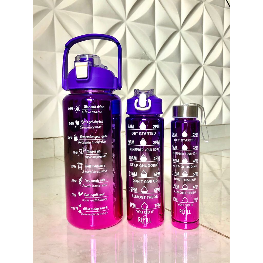 Kit 3 Garrafa Motivacional Água Preta Alça Adesivo 3d 1l 2l Squeeze Preto Tampa Inox ( 2 Litros - 900 ML - 300 ML )