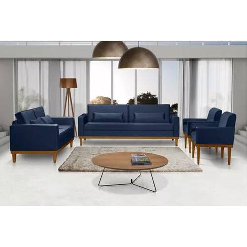Sofá Living 3 e 2 Lugares Valência - 2,20/1,58mts + 02 Poltronas C/ Base Madeira - Veludo Azul - Azul Petróleo