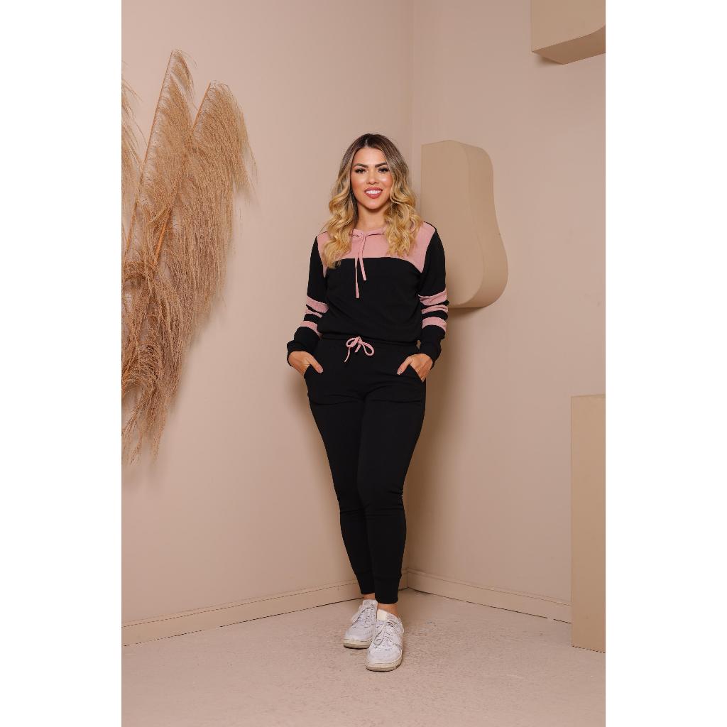Conjunto Moletom de Frio Feminino Malha Crepe Manga Longa Inverno com Capuz e Listras