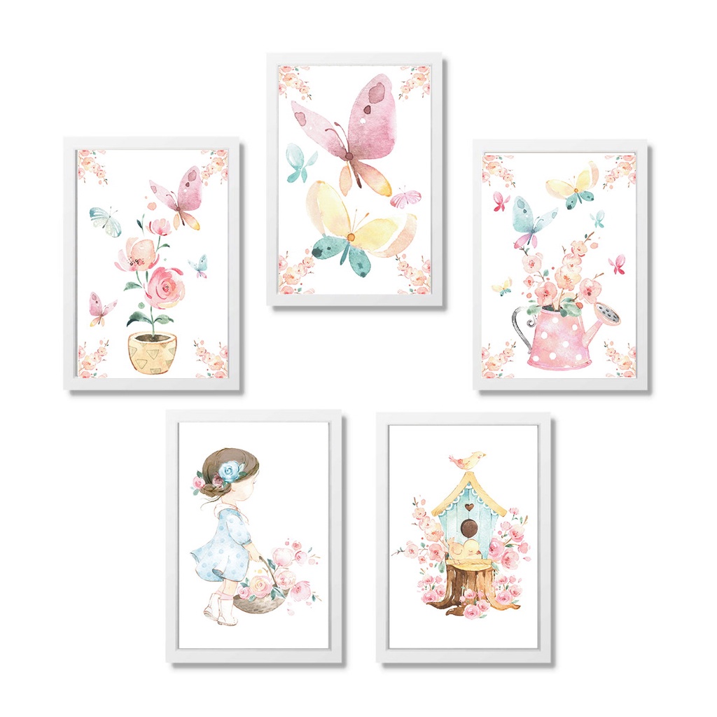 Quadro Decorativo 5 peças Menina Infantil Crianças Quarto Flores Borboletas Pássarinhos