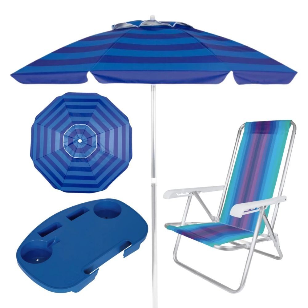 Kit Guarda-sol 2 M Azul + Mesa Portátil + 1 Cadeira 4 Posições Pesca / Praia