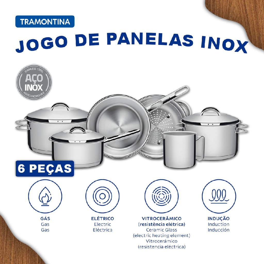 Jogo de Panelas Tramontina Solar em Aço Inox com Fundo Triplo e Tampas de Inox 6 Peças