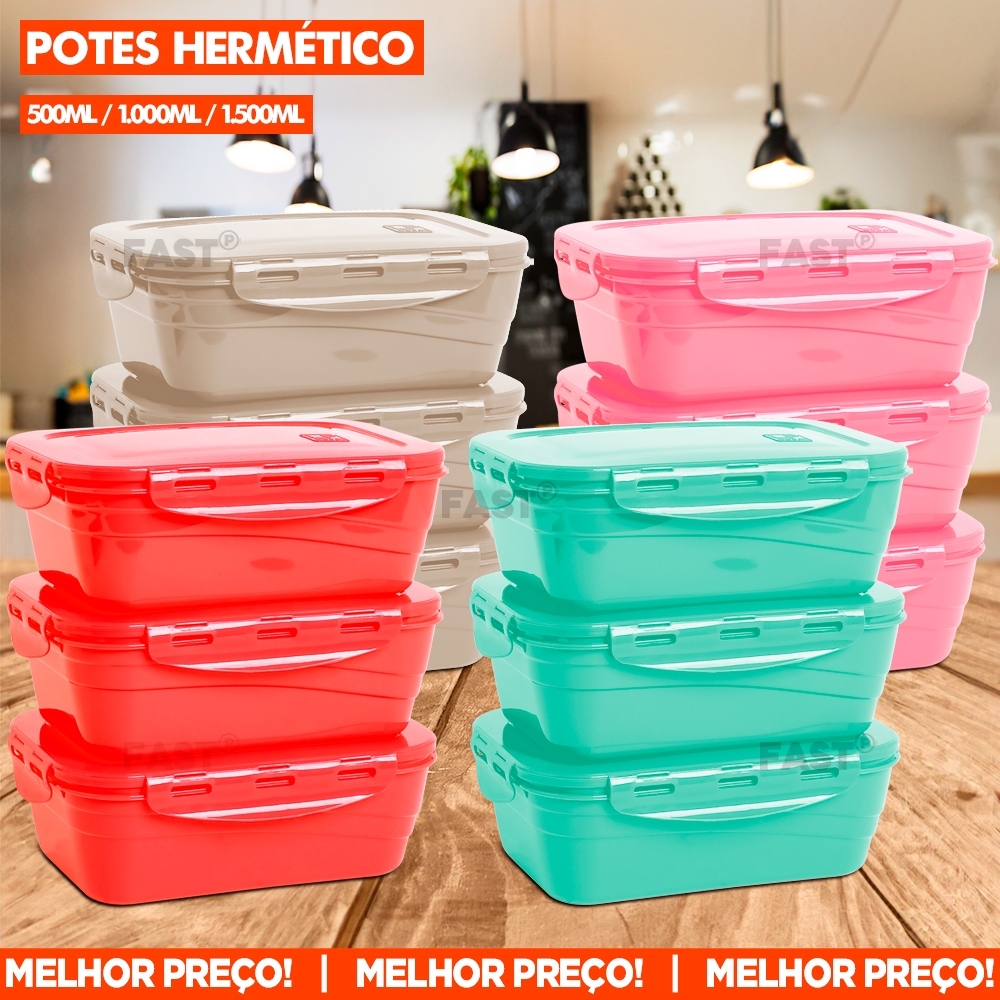 Kit 3 Pote de Vidro Hermético Retangular Marmita Fit com Tampa 4 Travas Colorido
