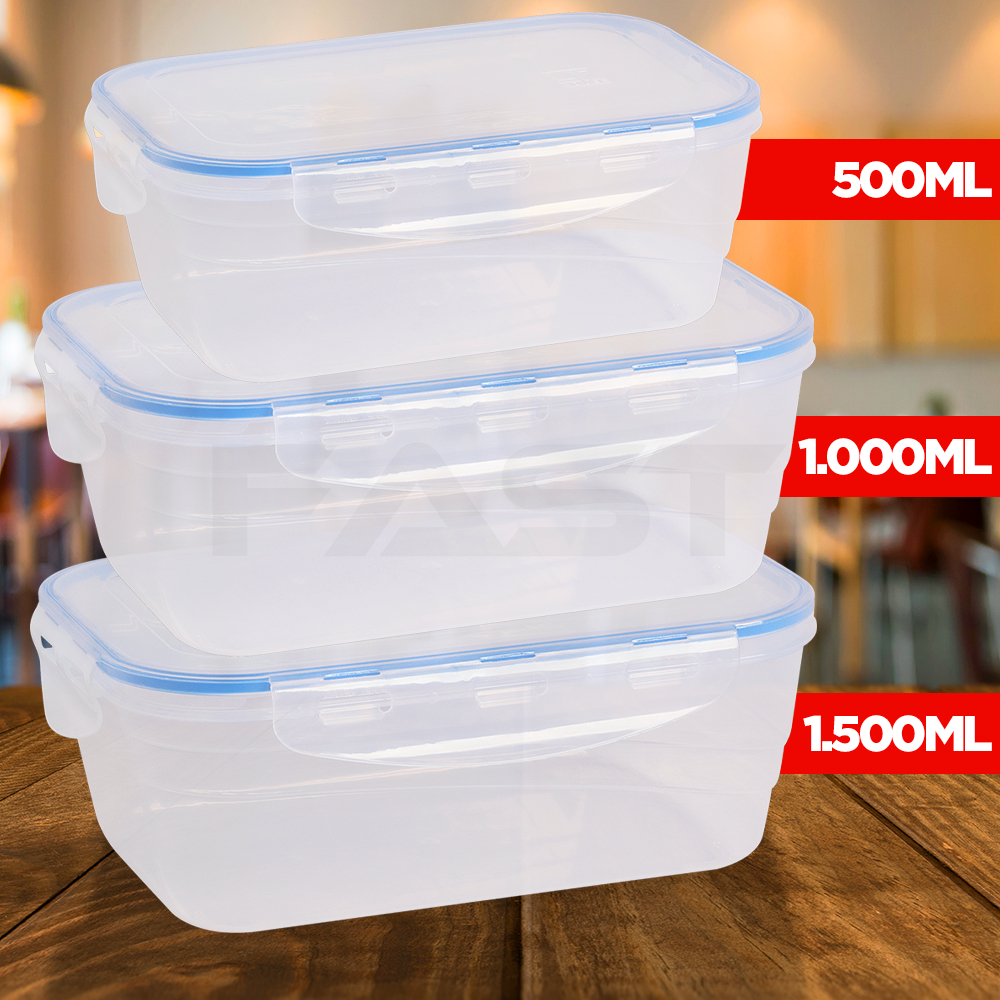 Kit 3 Potes Hermético 500ml/1L/1,5L , Plástico Resistente Tampa Trava Silicone Marmita Geladeira Microondas Freezer