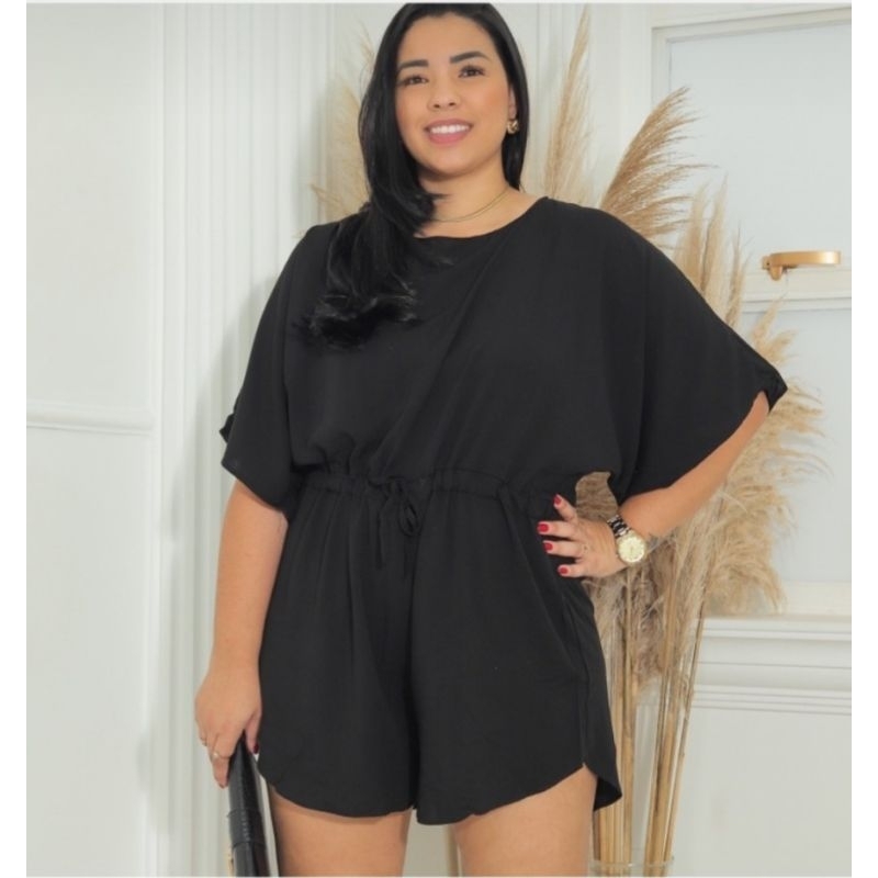 Macaquinho Plus Size Feminino Soltinho Tecido Duna regulagem na cintura cor Preta