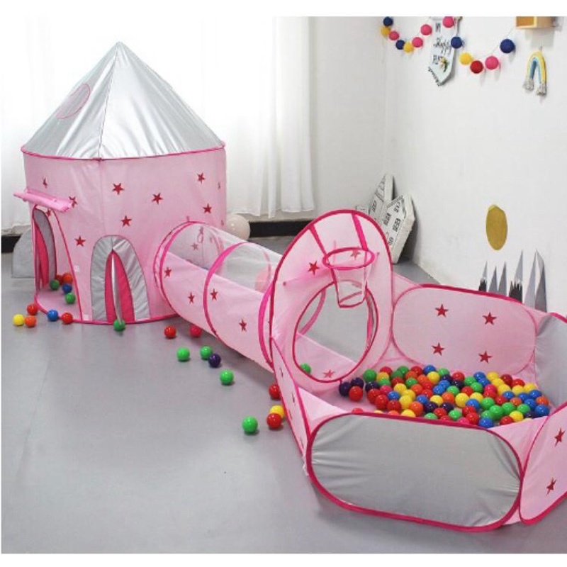 Tenda Toca Barraca Infantil Tunel 3x1com Piscina para Bolinhas Princesas Astronaltas com Cesta Basquete Playground Brinquedo