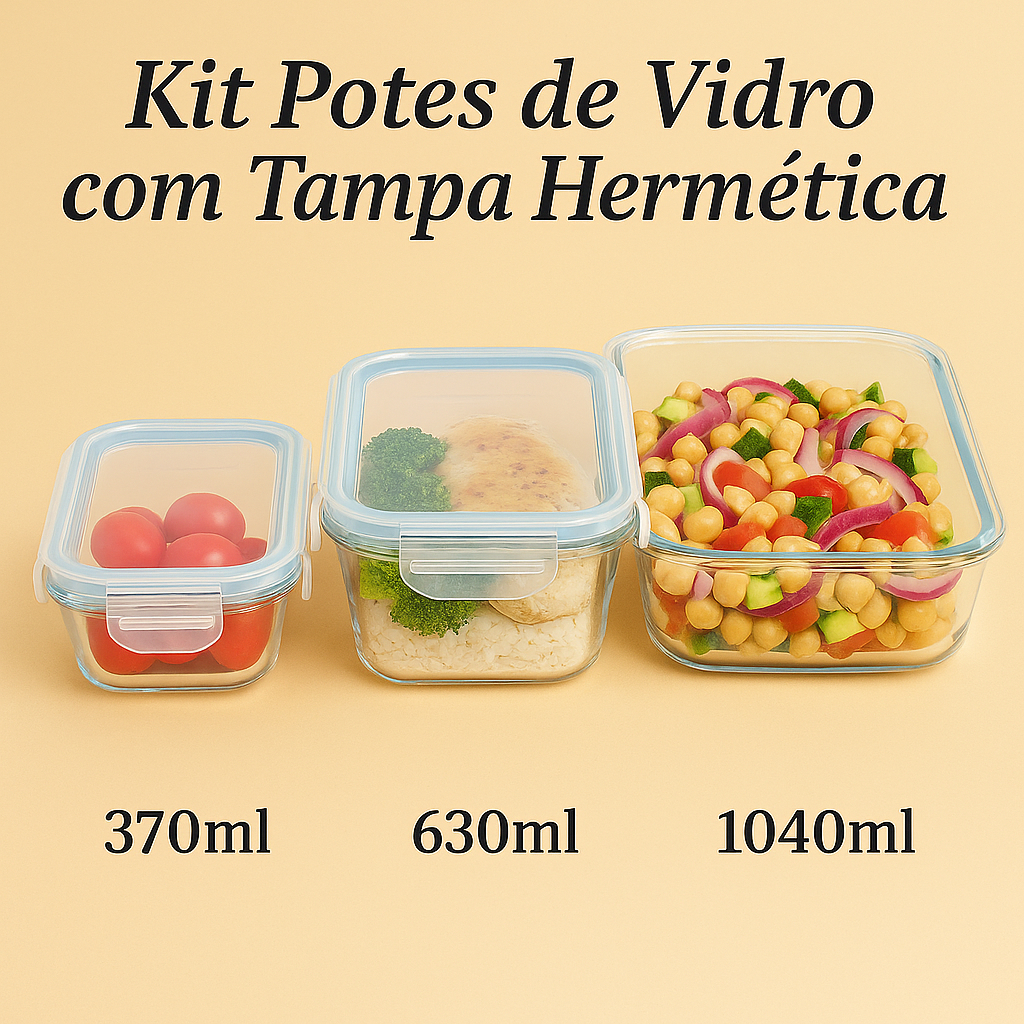Kit 3 Potes de Vidro Hermético 370ml 630ml 1040ml com Tampa 4 Travas Marmita Freezer