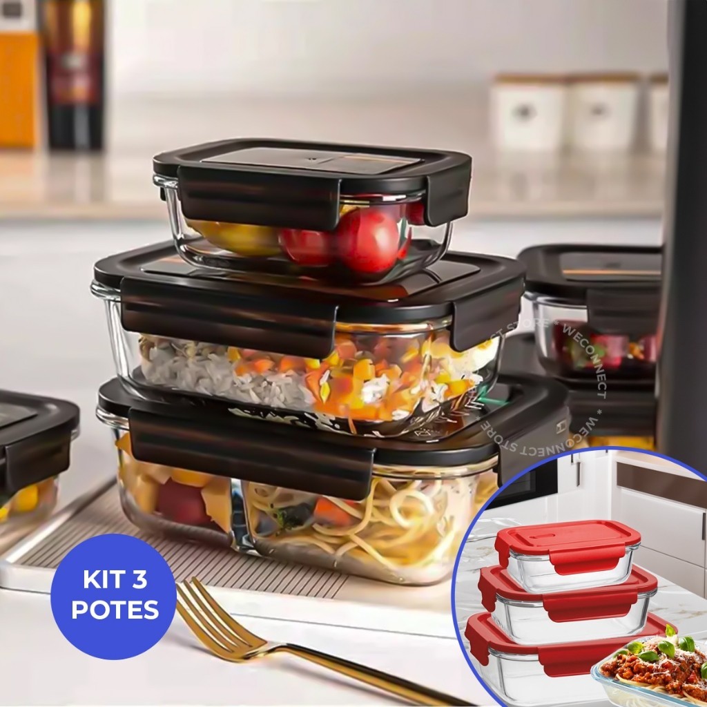 Kit 3 Potes de Vidro Hermético Tampa com Trava Marmita Fit Mantimentos