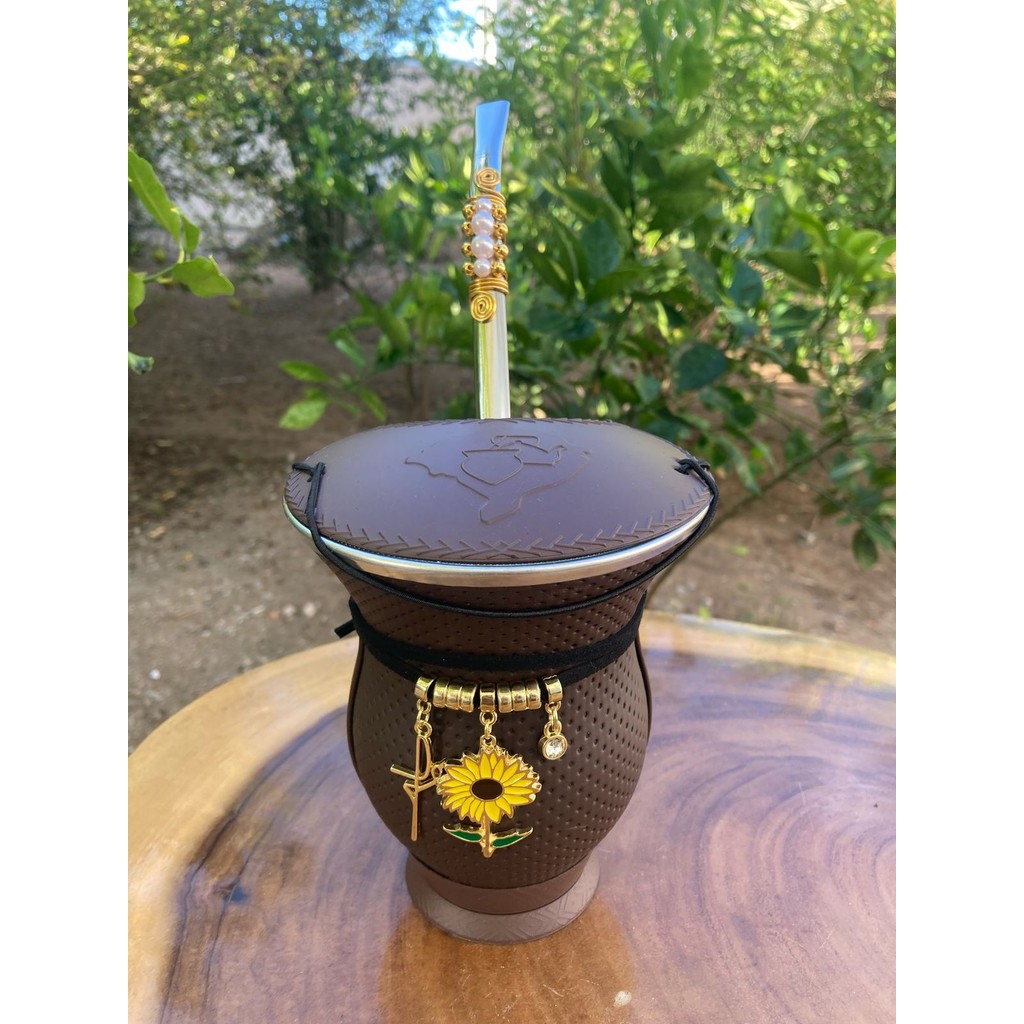 Kit chimarrão: Cuia de Porongo Revestida em Sintético Trançada + Bomba em inox decorada com pingente + Basic + Tapa Erva